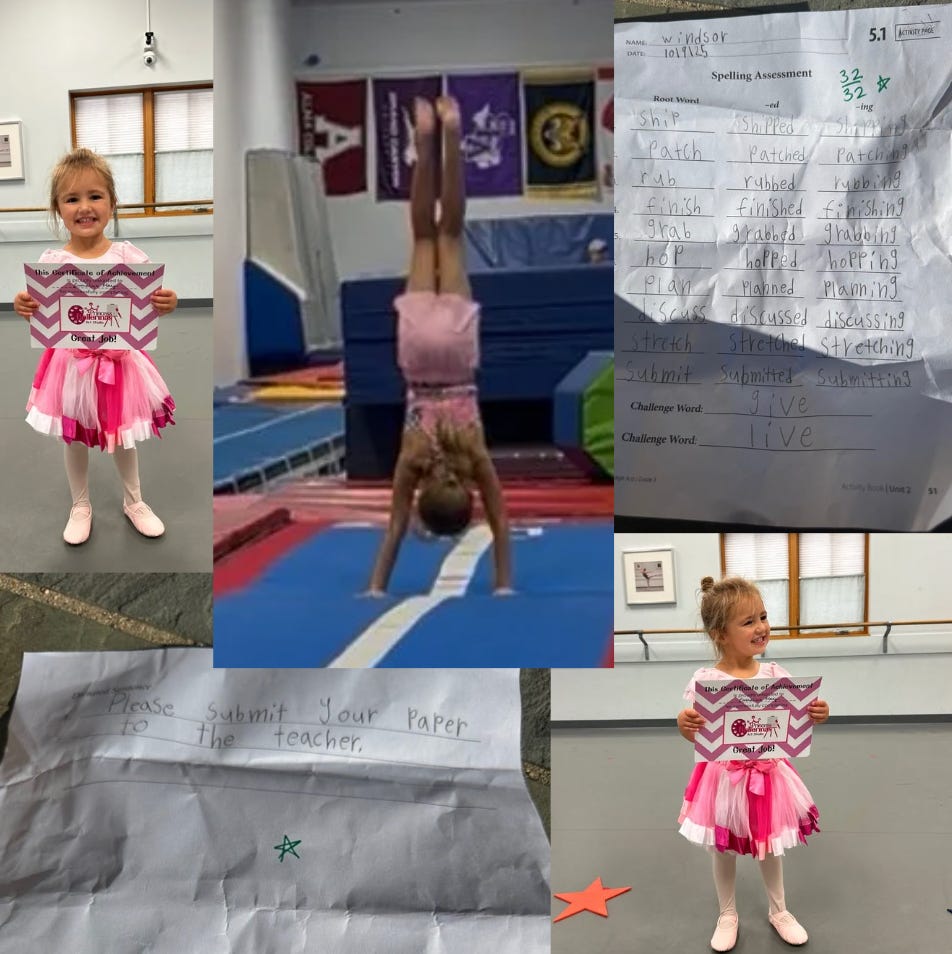 The days went quick, they always do and the weekend was one of my FAVS.. Everyone was a winner this week…. Windsor was so proud of her perfect spelling test, Emmaline sooo cute in her ballet class and Arabella is making so much progress with her back handsprings… the picture is of her in the middle of a triple!